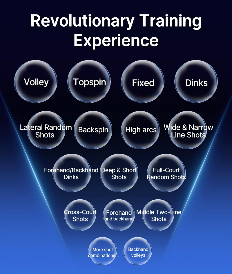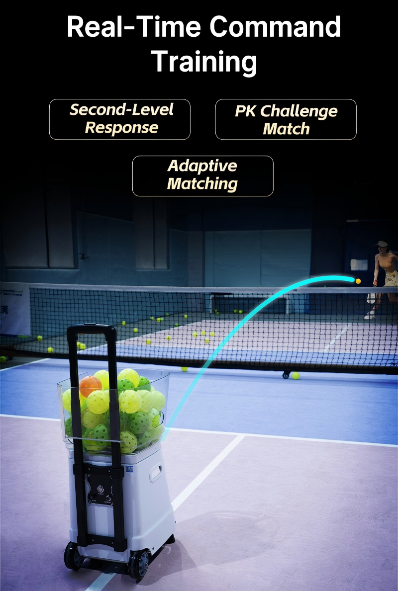It provides Precision Ball Delivery with fully adjustable parameters such as ball speed, various spin types (topspin, backspin, side spin), launch interval, shooting angle and height. With accurate pinpoint landing control, it is ideal for practicing dinks, volleys, lobs, cross‑court shots and other key skills, helping users improve precision and consistency.
