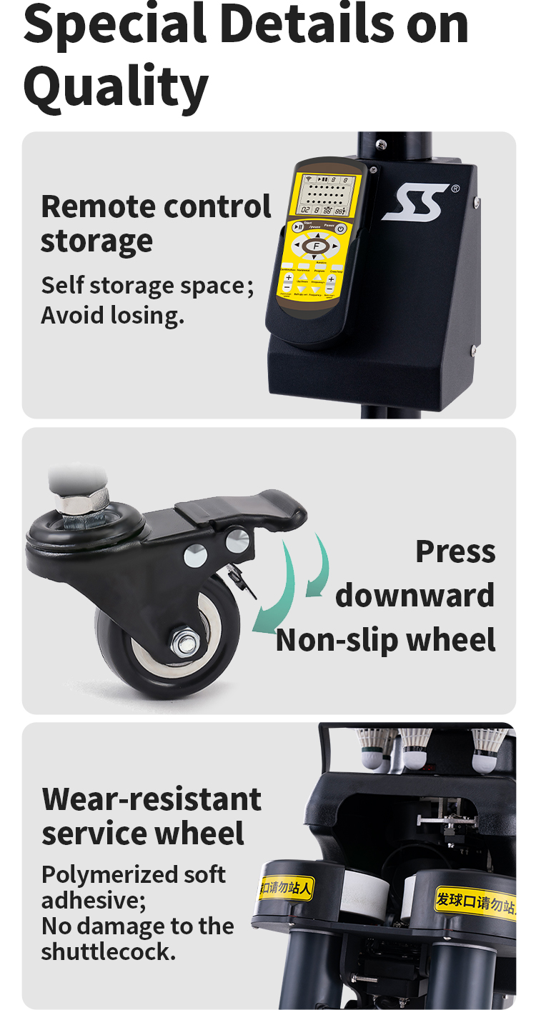3. Intelligent landing point programming, six kinds of cross-line drills, could be any combination of vertical swing drills, high clear drills, and smash drills;